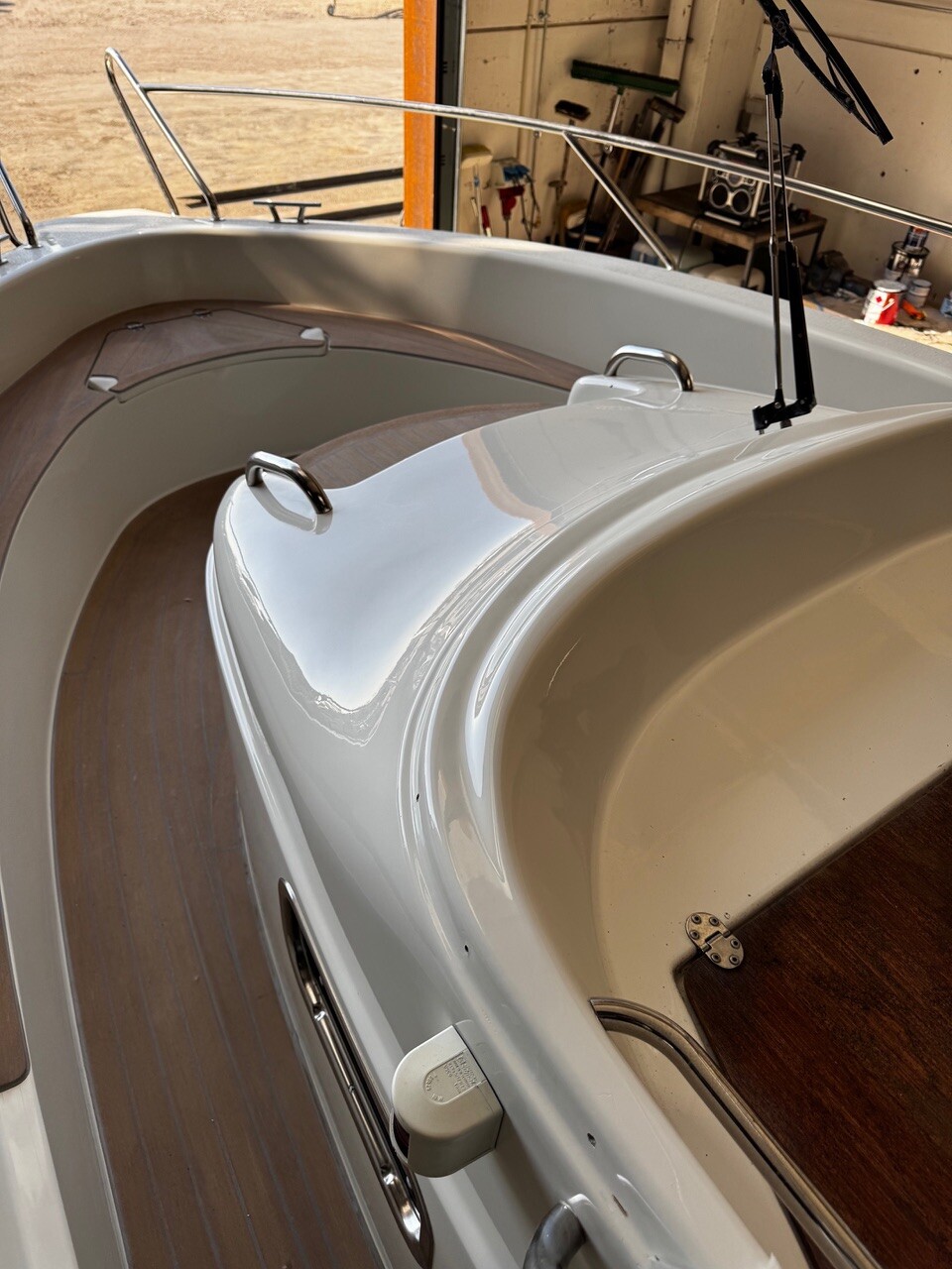 Beachten Sie, dass das Boot sehr schön ausgestattet ist – unter anderem mit Bugstrahlruder, neuer Persenning sowie einer vollabdeckenden Winterpersenning (siehe Bilder) – und gerade neue Fenster/Windschutzscheiben erhalten hat. Der Rumpf ist frisch am Unterboden lackiert, poliert und mit einer keramischen Beschichtung versehen worden, und zudem ist überall Flexiteek verlegt. Vielleicht eines der schönsten Modelle, die es gibt? Ein sehr umfangreiches und pflegeleichtes Boot für den Preis.